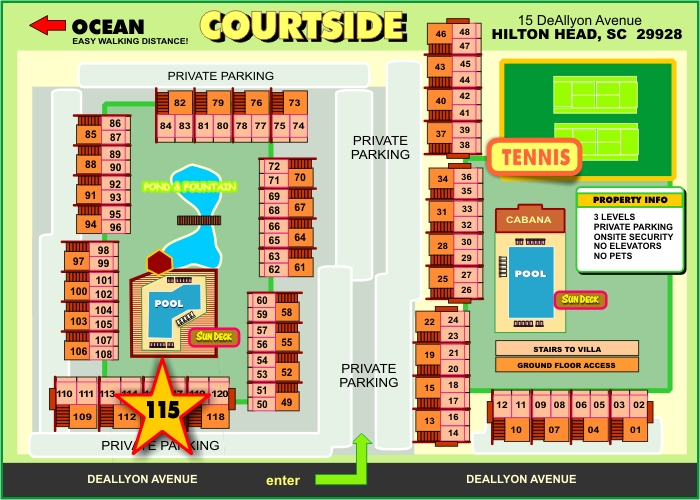 115 COURTSIDE is located within easy walking distance to Hilton Head’s nicest beach… close to golf, tennis, biking and great shopping. A few of our amenities include 2 large pools, pool cabana, large sun decks, plenty of lounge chairs & umbrellas, outdoor fountains and private parking. Ask about our free tennis!