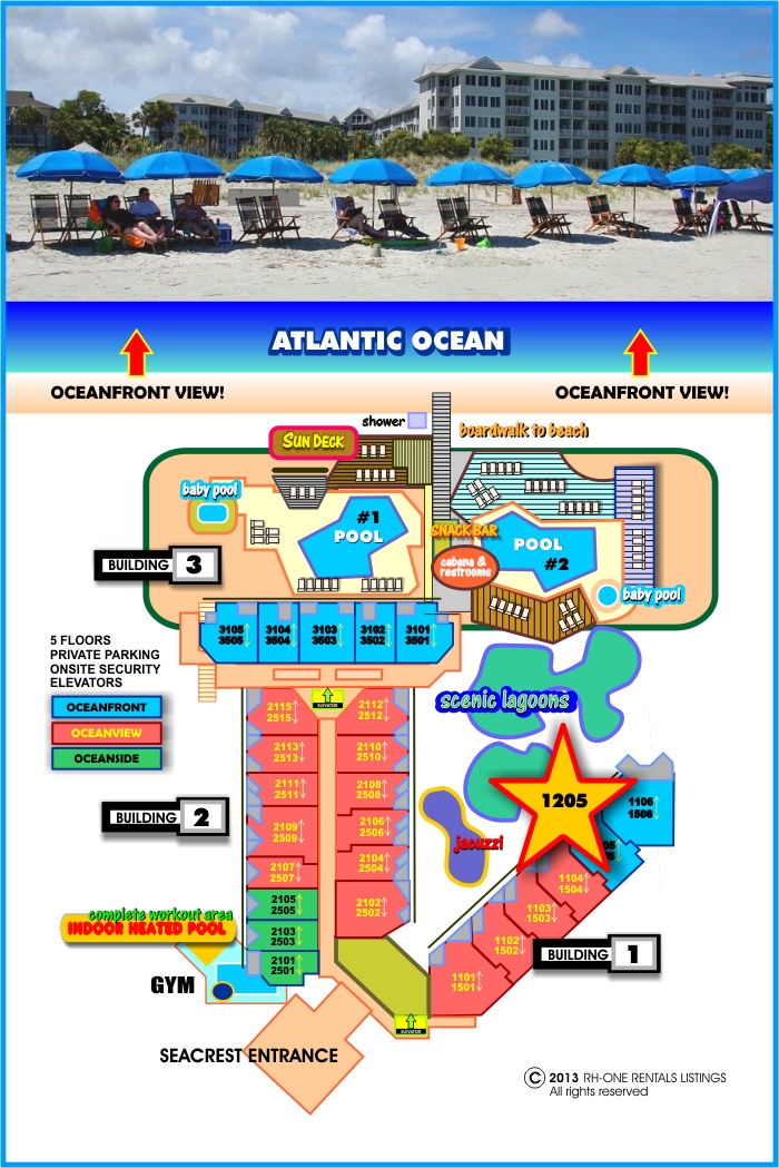 1205 SEACREST offers some of the nicest amenities available… large oceanfront pool, snack pool bar, kiddie pool, indoor heated pool & workout room, sundeck with plenty of lounge chairs and umbrellas. A boardwalk with outdoor shower leads you right to a large white sandy beach and clear blue ocean. Located in the Forest Beach area, here you will find not only the nicest beach on Hilton Head, but many bike trails, golf, tennis, fun activities, great restaurants and shopping are within close walking distance from the property.