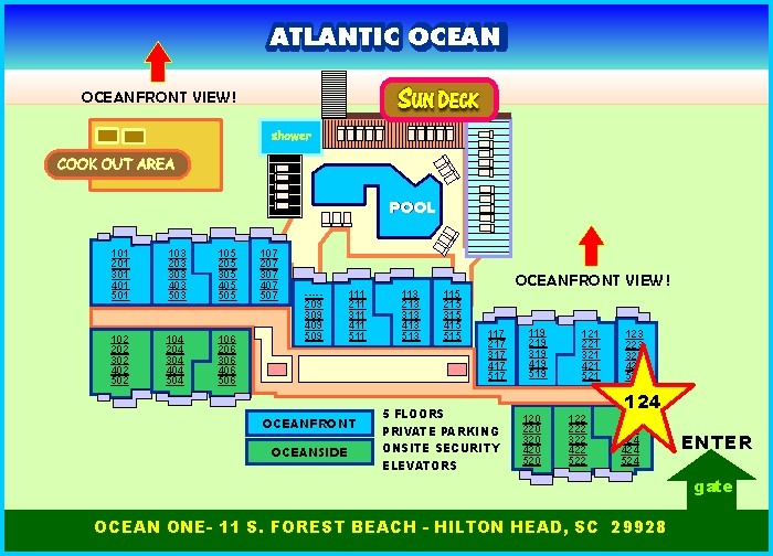 124 OCEAN ONE offers free parking and onsite security and is located on Hilton Head’s nicest beach… close to golf, tennis, biking. great shopping and restaurants. A few of our amenities include a large oceanfront pool, large sundeck, lounge chairs & umbrellas, beach shower and boardwalk that offers direct access to the beach. There are also grills and cookout area for Ocean One guests.