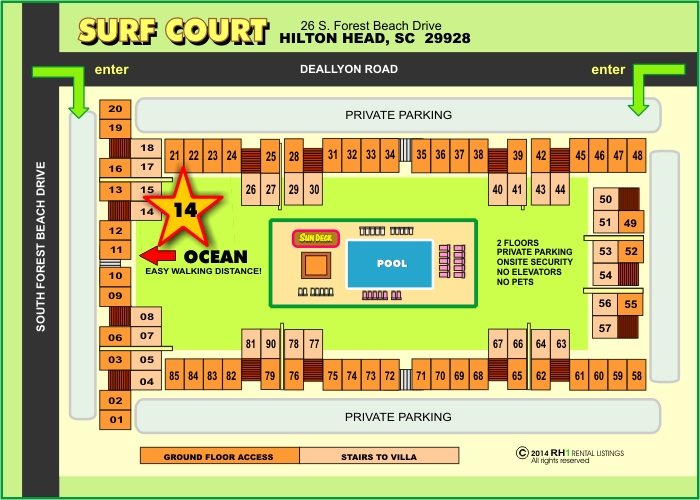 14 SURF COURT offers nice scenic views of the courtyard and direct access to the pool. Surf Court is located close to Hilton Head’s nicest beach… near by you will find golf, tennis, biking and great shopping. A few of our amenities include a large pool, large sundeck, with lounge chairs & umbrellas for your enjoyment.