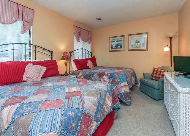 The second bedroom has 2 full beds and a private bath. Both bedrooms have a flat panel tv.