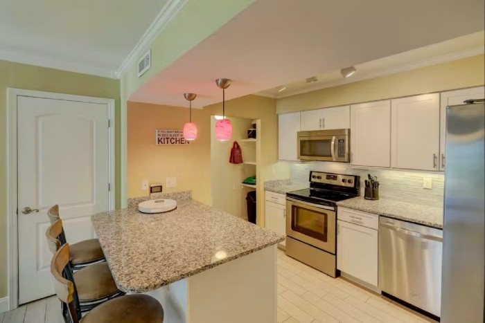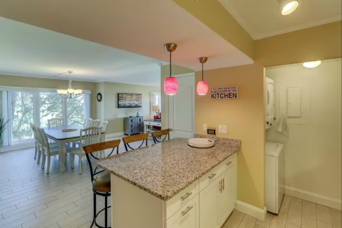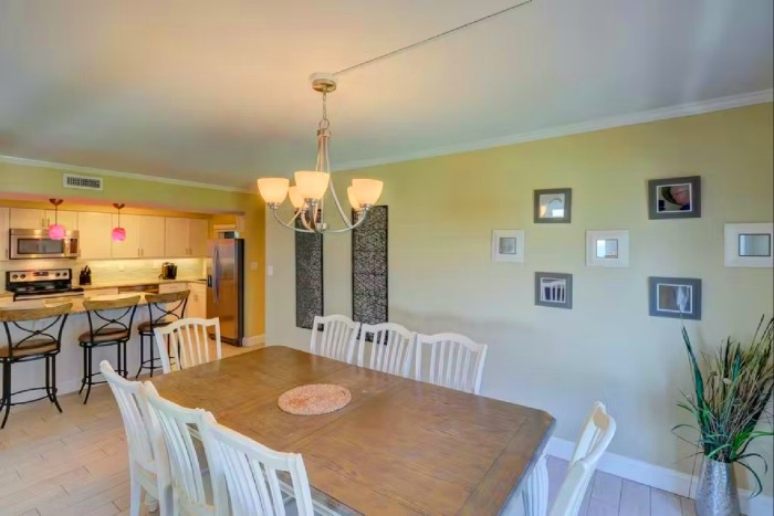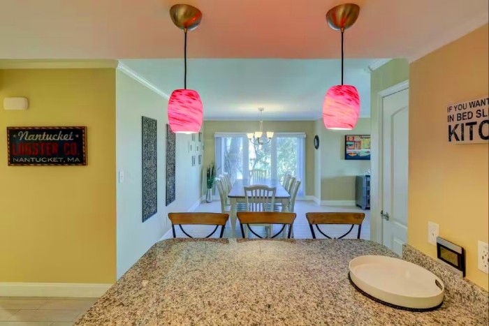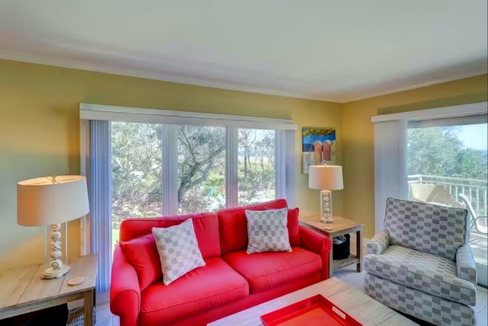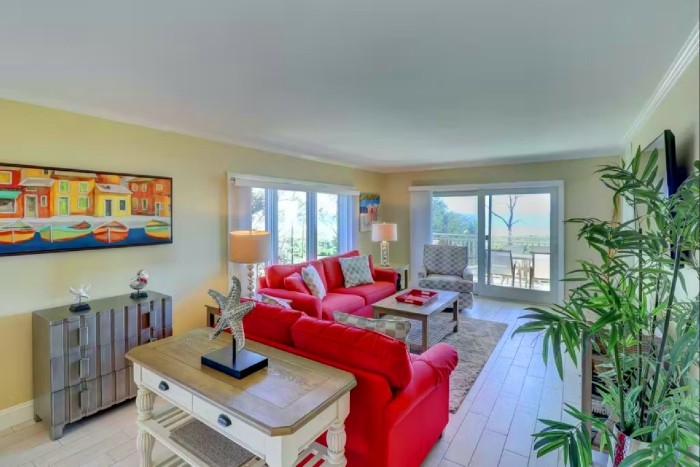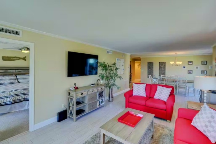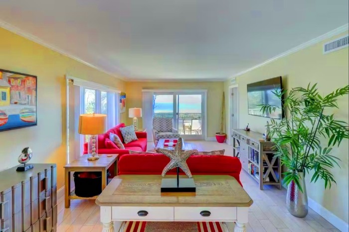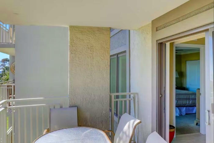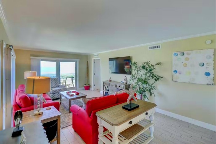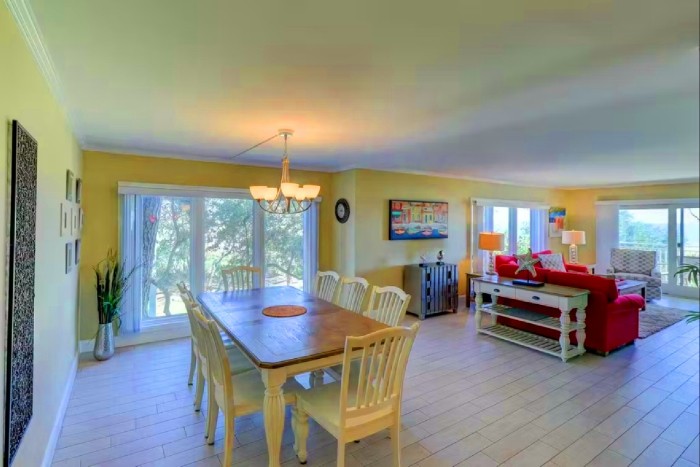 306 SHOREWOOD The villa is totally furnished and completely equipped… central AC, modern kitchen with all appliances, washer/dryer, dishwasher, ice maker, disposal, small appliances, all cookware, utensils, 4 TV’s with cable and high speed internet. The villa is also supplied with all bath and bed linens and starter supply of soaps and tissues. Free Wi-Fi and long-distance phone (domestic US) are included. The fully-equipped kitchen has granite counter tops and stainless steel appliances. The dining room seats up to six. The living room is spacious and has a large, flat-screened TV and boasts a great view of the ocean. Enjoy the view from this second-floor villa from the large balcony with plenty of seating.