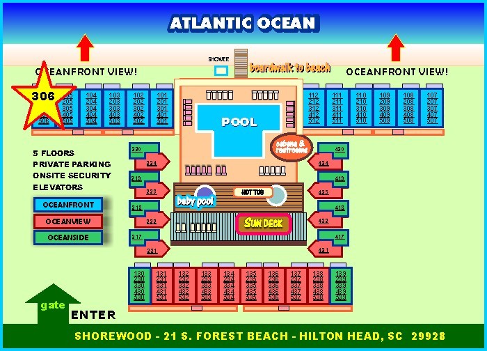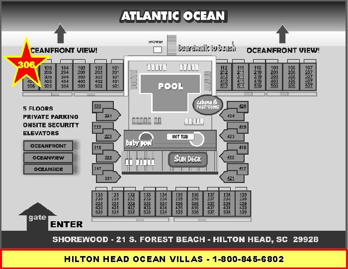 306 SHOREWOOD offers the best direct oceanfront views and is located on Hilton Head’s nicest beach… close to golf, tennis, biking and great shopping. A few of our amenities include a large zero entry oceanfront pool. hot tub, kiddie pool, large sundeck, pool cabana with changing area and restrooms, lounge chairs and umbrellas, beach shower and boardwalk offering direct access to the ocean.