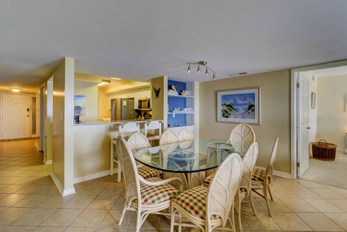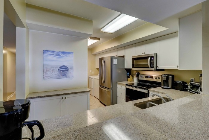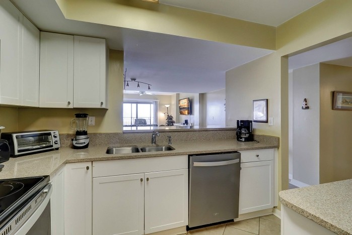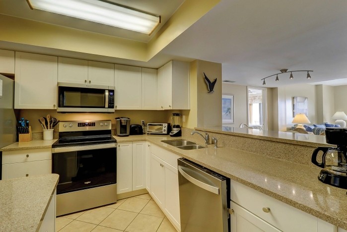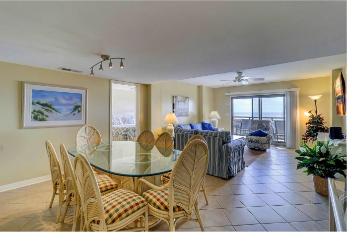 313 OCEAN ONE This spacious villa comes fully furnished and completely equipped modern kitchen new granite counter top bar, all appliances, refrigerator, dishwasher, microwave, washer/dryer, disposal, ice maker, (4) TV’s with cable, (1) dvd’s, small appliances, all cookware, utensils, central AC, all bath and bed linens, blankets, ironing board and starter supply of soaps and tissues…The Third Bedroom has a bunkbed with a twin size bed over a full bunkbed, plus a full size trundle bed. This bedroom also has a private bath. There is a third balcony that is located directly off the main living area with seating!