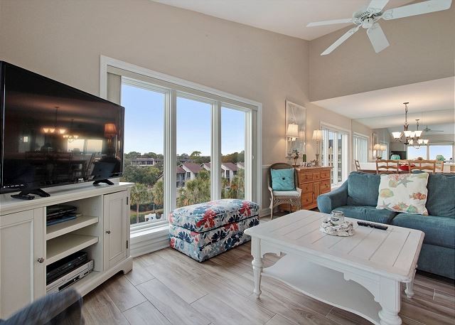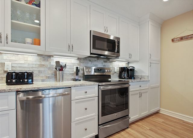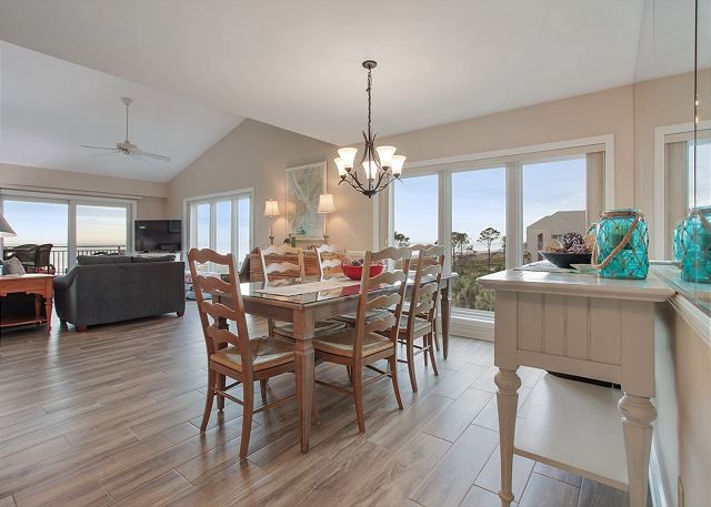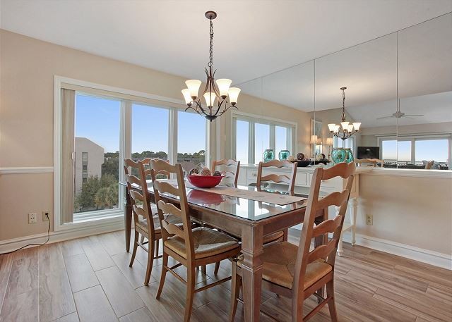 501 SHOREWOOD The villa is totally furnished and completely equipped… central AC, modern kitchen with all appliances, washer/dryer, dishwasher, ice maker, disposal, small appliances, all cookware, utensils, 4 TV’s with cable and high speed internet. The villa is also supplied with all bath and bed linens and starter supply of soaps and tissues. Free Wi-Fi and long-distance phone (domestic US) are included. The fully-equipped kitchen has granite counter tops and stainless steel appliances. The dining room seats up to six. The living room is spacious and has a large, flat-screened TV and boasts a great view of the ocean. Enjoy the view from this penthouse villa from the large balcony with plenty of seating.
