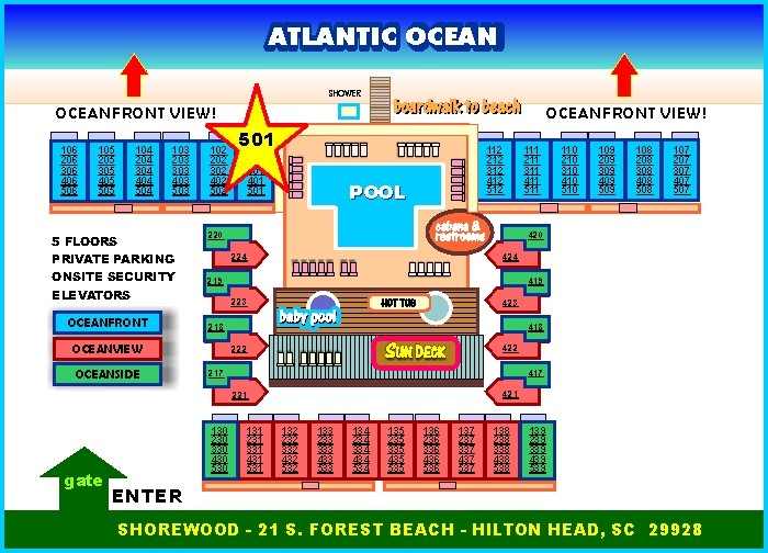 501 SHOREWOOD offers the best direct oceanfront views and is located on Hilton Head’s nicest beach… close to golf, tennis, biking and great shopping. A few of our amenities include a large zero entry oceanfront pool. hot tub, kiddie pool, large sundeck, pool cabana with changing area and restrooms, lounge chairs and umbrellas, beach shower and boardwalk offering direct access to the ocean.