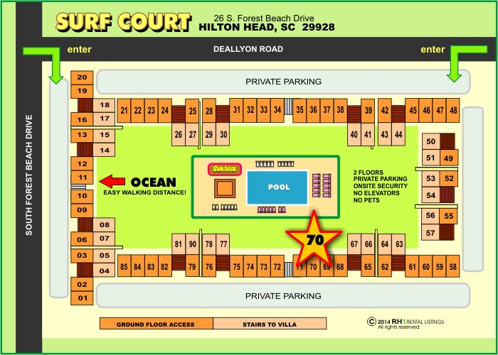 70 SURF COURT offers nice scenic views of the courtyard and direct access to the pool. Surf Court is located close to Hilton Head’s nicest beach… near by you will find golf, tennis, biking and great shopping. A few of our amenities include a large pool, large sundeck, with lounge chairs & umbrellas for your enjoyment.