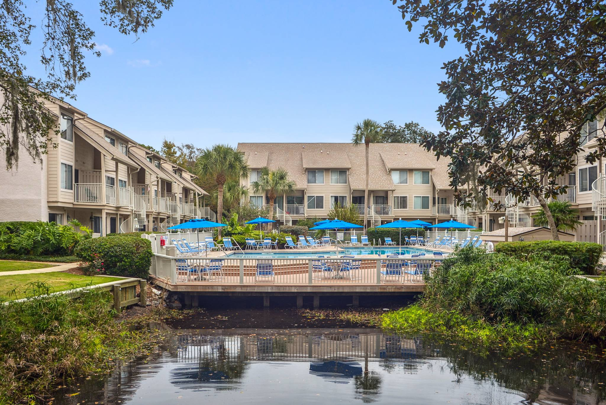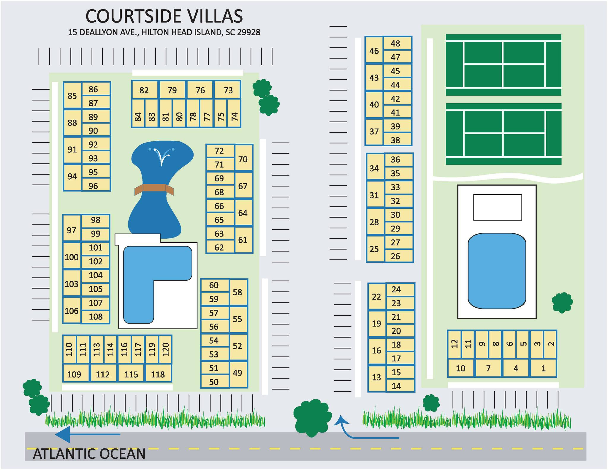 This community has two on-site pools, a lagoon with fountain, and parking at the front door of each property. Courtside is within 3 blocks of Coligny Plaza, the Beach Market and the new Lowcountry Celebration Park.
